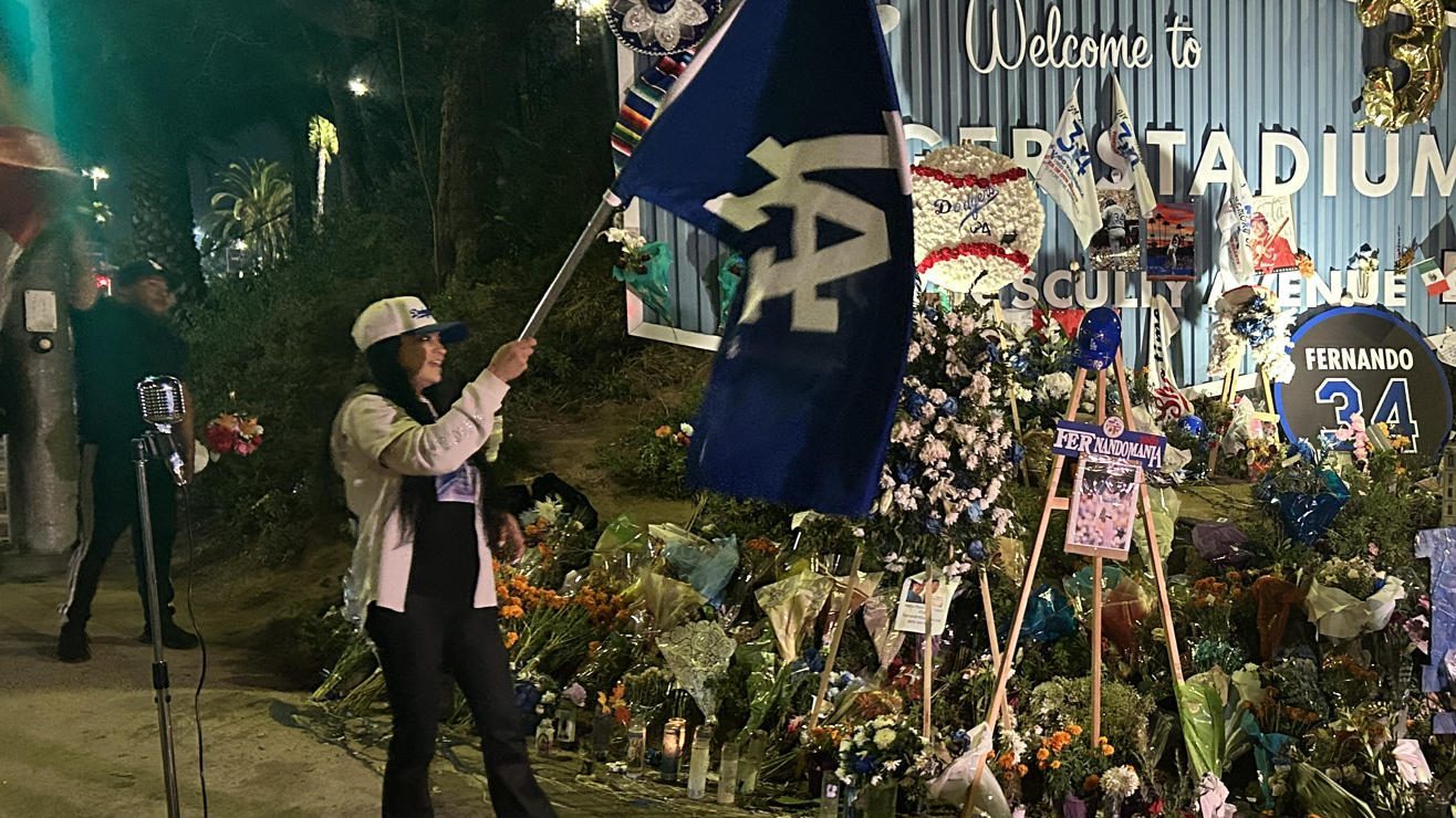 Los aficionados bailaron, gritaron y cantaron el corrido dedicado a Valenzuela frente al imponente letrero del estadio, que se ha convertido en un altar en honor al legendario jugador mexicano.