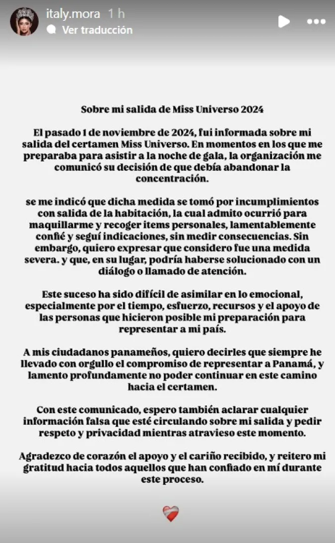 Italy Mora comparte su versión sobre la expulsión del Miss Universo 2024