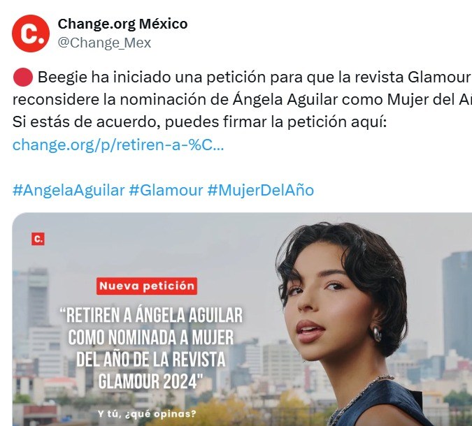 “Beegie ha iniciado una petición para que la revista Glamour reconsidere la nominación de Ángela Aguilar como Mujer del Año 2024”, destaca una publicación de la plataforma Change en su cuenta de la red social X.