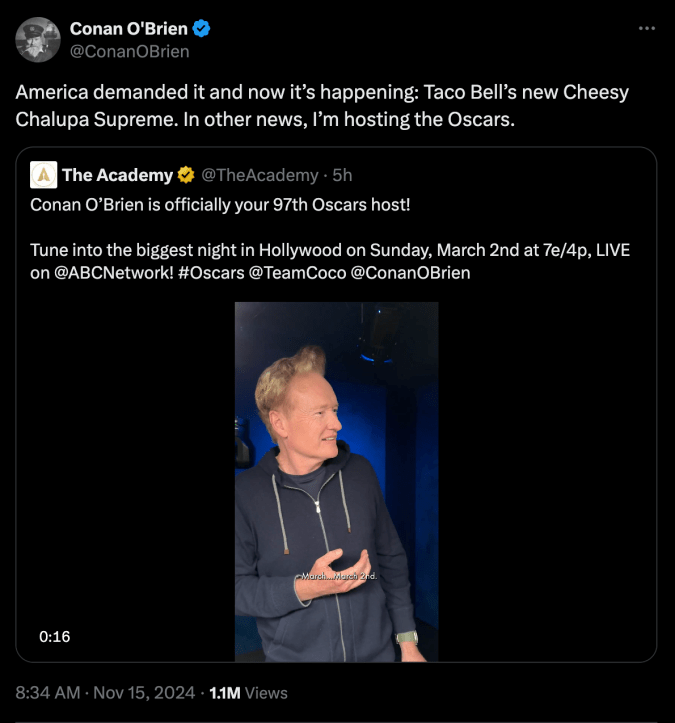 Fiel a su estilo, O’Brien reaccionó al anuncio con una broma en X (Twitter): “Estados Unidos lo pidió y ahora es realidad: el nuevo Cheesy Chalupa Supreme de Taco Bell. En otras noticias, seré el anfitrión de los Óscar”.