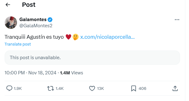 Gala acudió a X para decirle a Porcella que se “quedara con Agustín”, y que podía “sobrevivir a un unfolllow”, esto después de que el influencer la dejara de seguir por unos comentarios que emitió sobre Fernández y él.