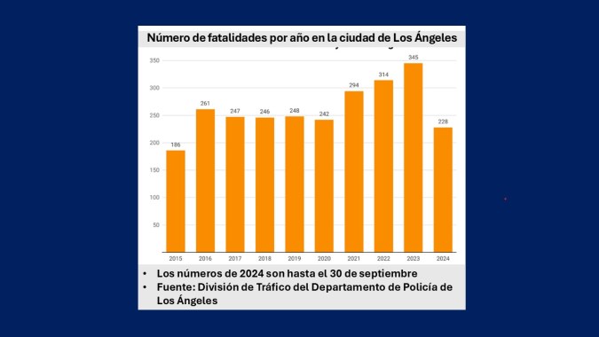 Del 1 de enero al 1 de septiembre se registraron 228 muertes relacionadas con vehículos, de acuerdo con datos de la División de Tráfico del Departamento de Policía de Los Ángeles. Esto supone 14 muertes menos que en el mismo período de 2023.