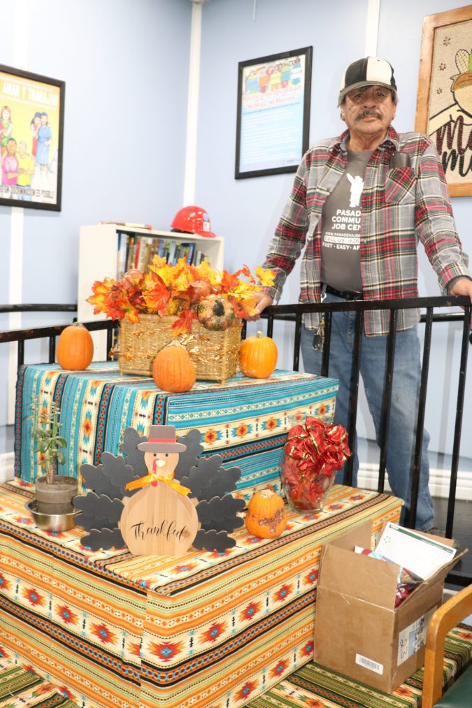 Desde muy temprana hora, jornaleros que esperan ser contratados para trabajar pulieron el piso del Centro Comunitario de Empleo en Pasadena y acomodaron mesas y sillas para compartir una cena de Acción de Gracias.