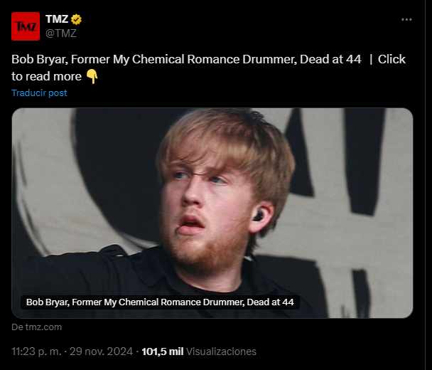 El mundo de la música alternativa está de luto tras la noticia del fallecimiento de Bob Bryar, exbaterista de My Chemical Romance (MCR). Según reporta TMZ, Bryar, de 44 años, fue hallado muerto en su domicilio en Tennessee el pasado martes. Fuentes policiales informaron al medio que Bryar había sido visto con vida por última vez el 4 de noviembre.