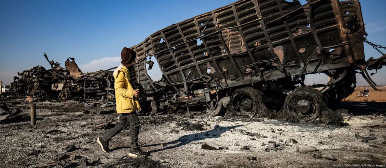 Varios vehículos militares quedaron destruidos tras un ataque aéreo israelí que tuvo como objetivo cargamentos de armas que pertenecían a las fuerzas gubernamentales sirias en Qamishli, en el noreste de Siria. (10.12.2024) Crédito: DELIL SOULEIMAN/AFP/Getty Images | copyright