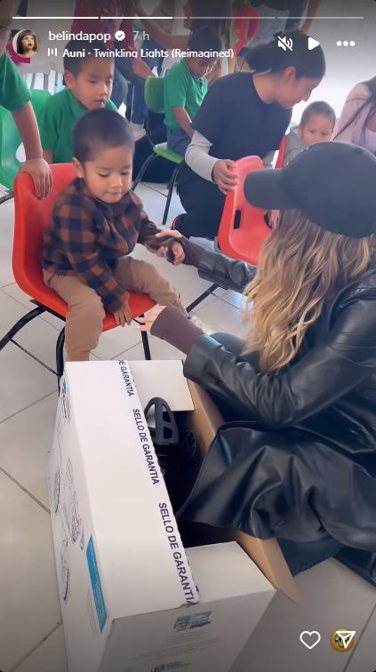 Belinda mostró en sus historias de Instagram algunos de los obsequios que llevó para los niños, entre los que destacaban juegos de mesa, dulces, zapatos y prendas de ropa, algunas de ella como un conjunto deportivo que utilizó durante una de sus giras.
