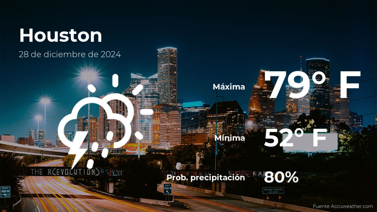 El clima en Houston, Texas, para este sábado 28 de diciembre llegará con el cielo mayormente nublado. Según la última información del parte meteorológico de AccuWeather, la temperatura alcanzará los 79 grados Fahrenheit (26ºC) de máxima durante el día, mientras que para la noche se esperan 52 grados Fahrenheit (11ºC) de mínima.