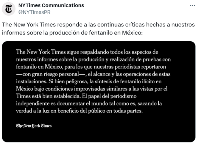 “The New York Times sigue respaldando todos los aspectos de nuestros informes sobre la producción y realización de pruebas con fentanilo en México, para lo que nuestras periodistas reportaron – con gran riesgo personal, el alcance y las operaciones de estas instalaciones”, destaca la publicación de diario estadounidense.