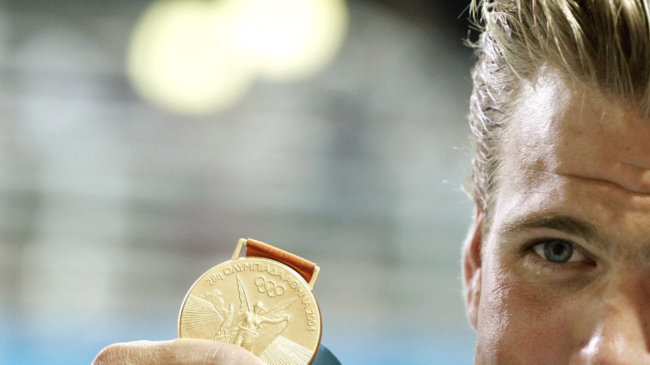 Gary Hall sonríe con una de las medallas de oro que obtuvo en Atenas 2004. Crédito: Mark Baker | AP