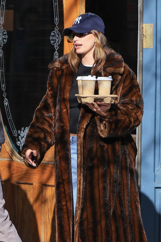 Por supuesto, Hailey como buena fashion lucía increíble con una camiseta negra ajustada, la cual combinó con jeans de cintura alta y un abrigo de pie de color marrón.