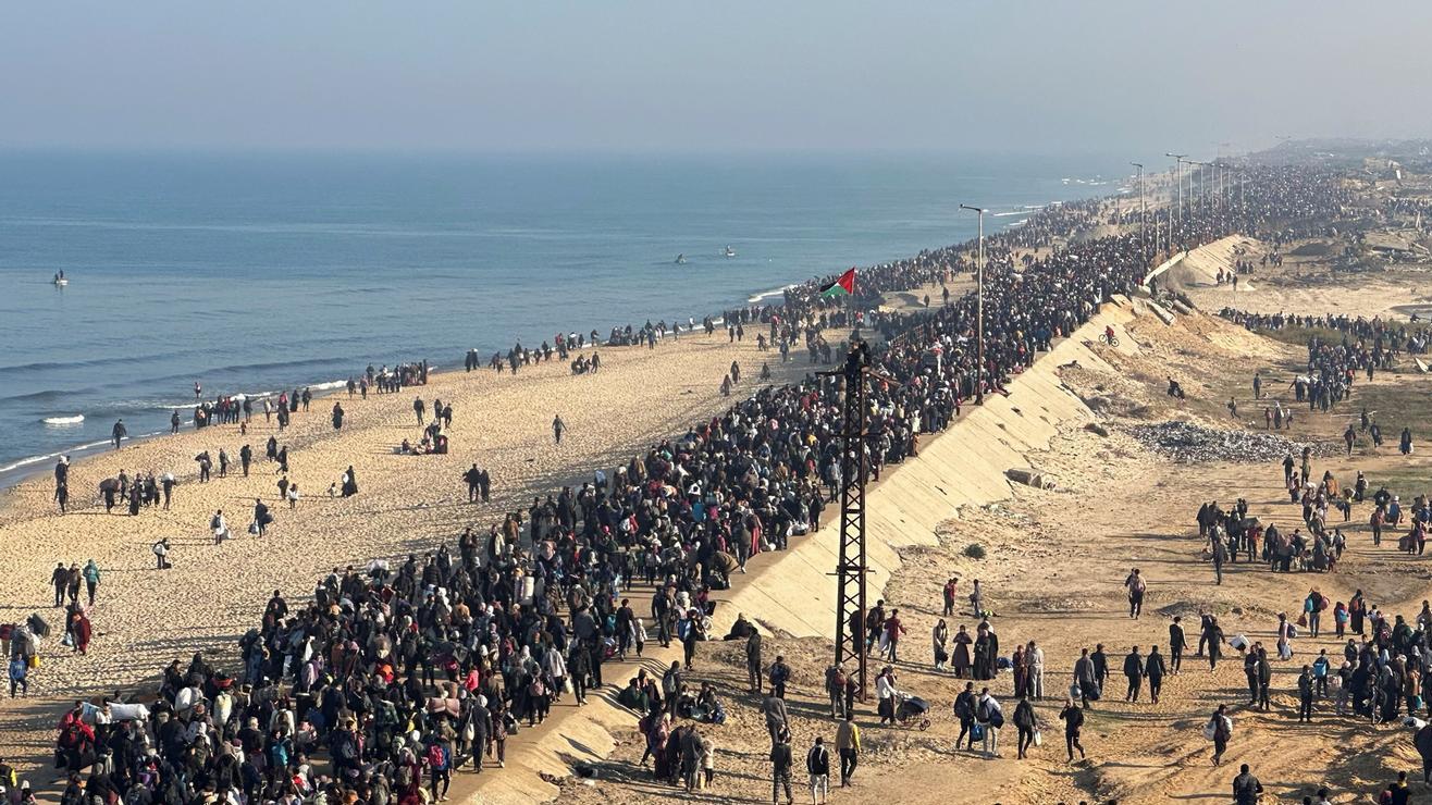 Miles de palestinos, algunos con carretas cargadas de equipaje, avanzaban por la ruta Al Rachid por la costa de Gaza, según la agencia de noticias AFP.
