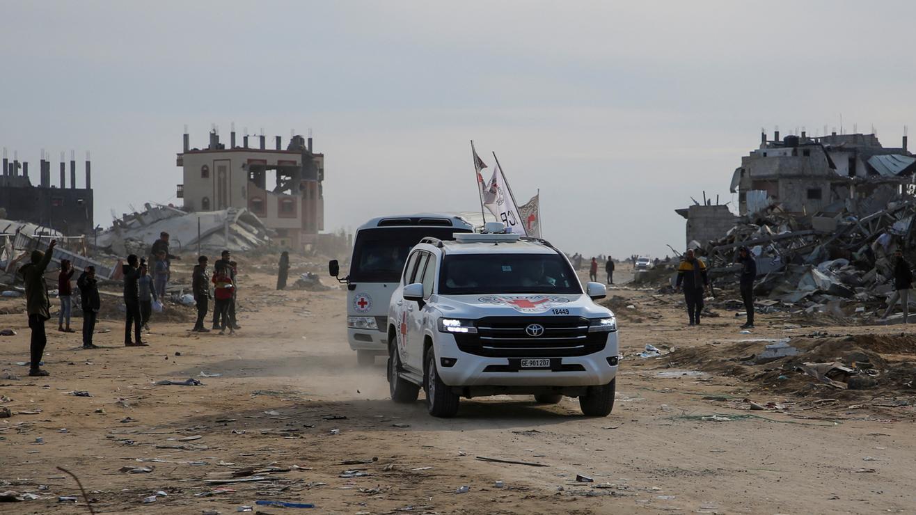 Buses de la cruz Roja transportan a los palestinos liberados. Crédito: Deutsche Welle