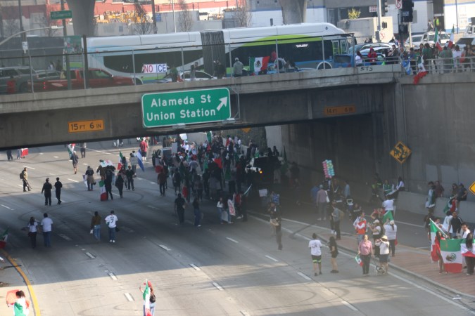 La multitud comenzó a reunirse en torno a la Placita Olvera como a las 12 del medio día, desde donde marcharon por la Avenida Alameda hacia la calle Aliso, y en la entrada a la autopista por la calle Los Ángeles se internaron peligrosamente a la autopista 101.