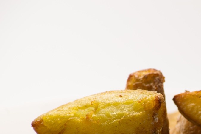 Este paso es sumamente importante, ya que aquí se elimina el exceso de almidón, lo que a su vez da pie a la obtención de una textura crujiente por fuera y suave por dentro. Después de este tiempo, y tras haber retirado del agua las papas y haberlas secado, deberás añadir una buena cantidad de aceite para obtener la capa crujiente.