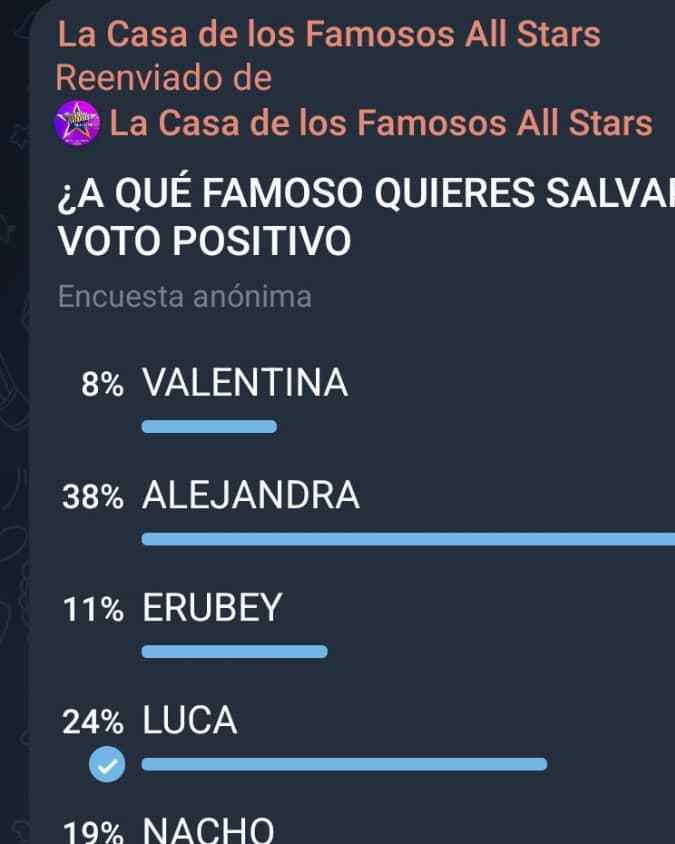 La cuenta de Telegram ‘Universo Reality’, que cuenta con más de 59 mil suscriptores, en el primer lugar está Alejandra Tijerina con 38 % de aceptación.