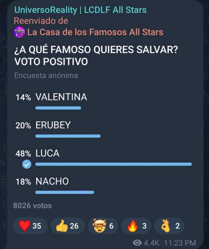 Ahora que Tijerina salió de la placa, los nominados son: Luca, Erubey, Valentina y Nacho. De acuerdo a la nueva encuesta de ‘Universo Reality’, Luca estaría liderando la tabla, le sigue Erubey con 20 % y en el tercer puesto está Nacho con 18 %, mientras que en la última posición está Valentina.