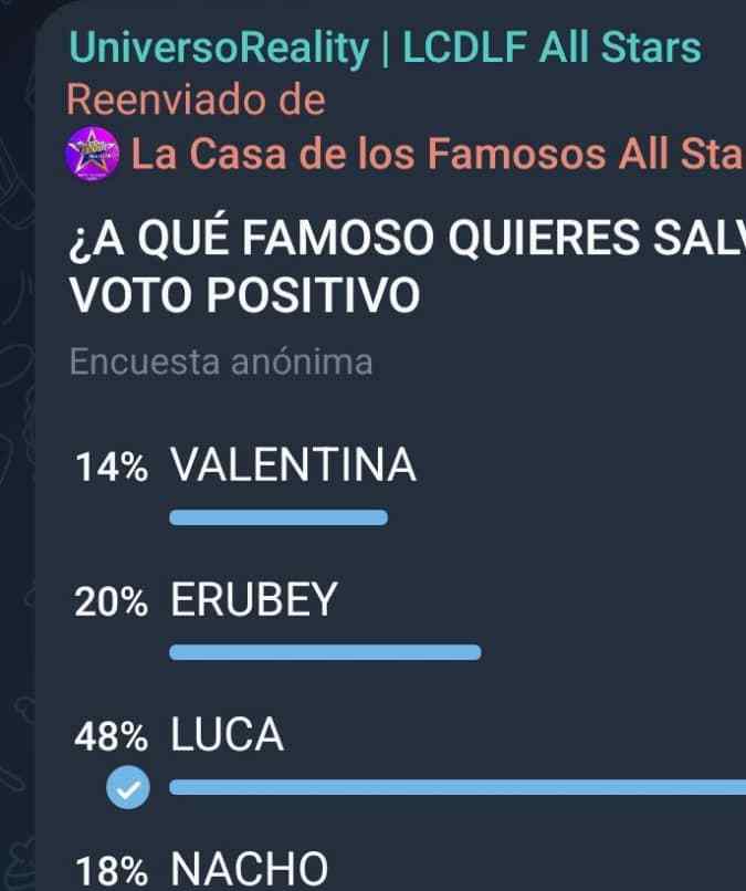 Ahora que Tijerina salió de la placa, los nominados son: Luca, Erubey, Valentina y Nacho. De acuerdo a la nueva encuesta de ‘Universo Reality’, Luca estaría liderando la tabla, le sigue Erubey con 20 % y en el tercer puesto está Nacho con 18 %, mientras que en la última posición está Valentina.