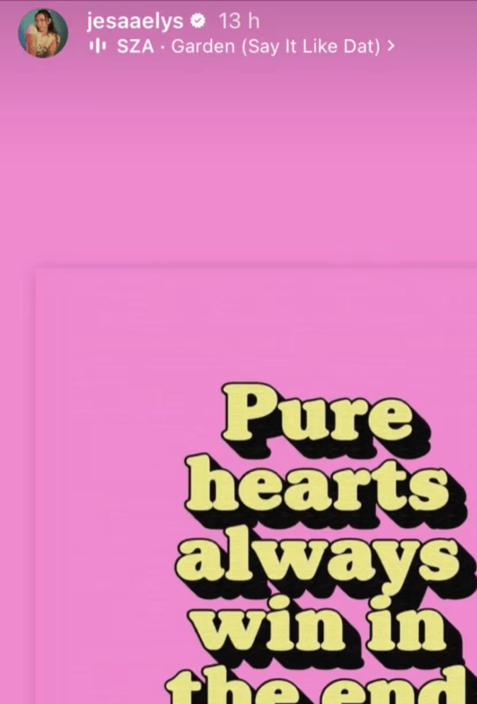 La imagen colocada desde sus historias muestra el texto en inglés: “Pure hearts always win in the end”, que en español recita: “Los corazones puros siempre ganan al final”.