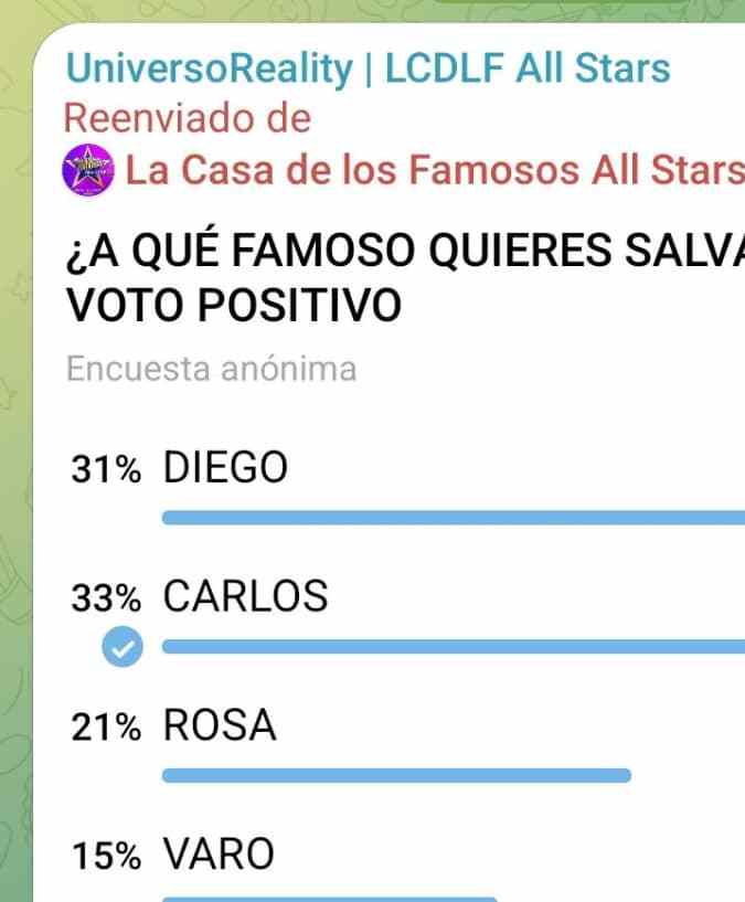 Según la tabla de Universo Reality, una cuenta de Telegram que se dedica a la divulgación del programa de telerrealidad de Telemundo, Carlos tiene 33 % de aceptación, le sigue Diego con 31 %, en el tercer lugar está Rosa y, en la última posición, Varo.