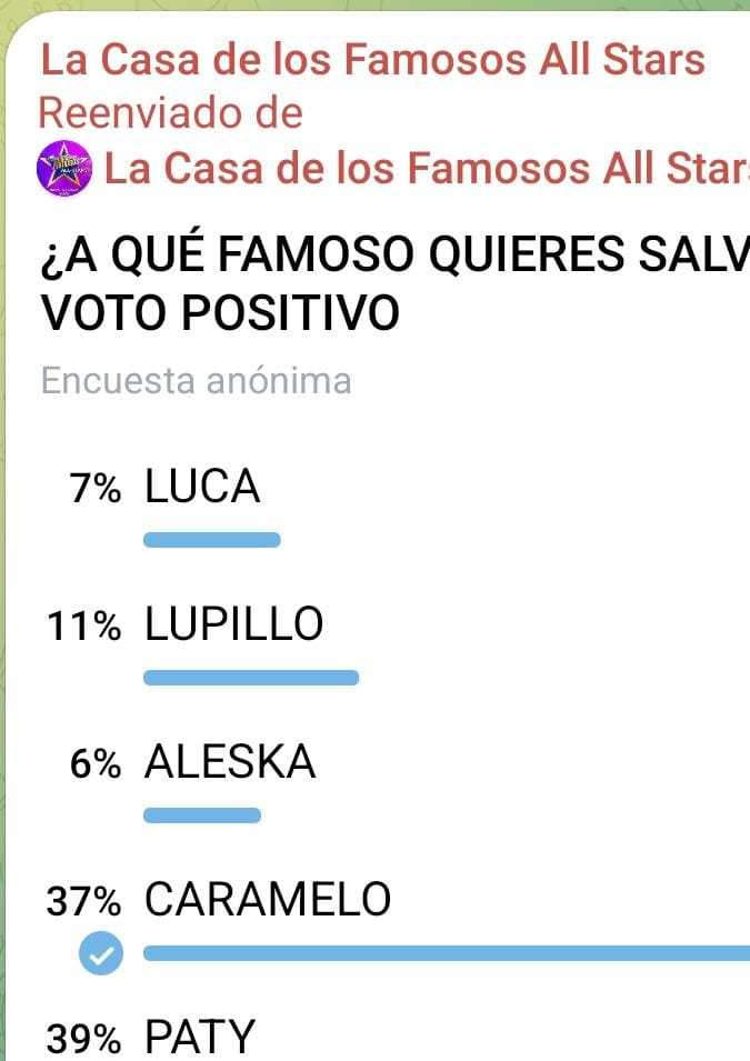 De acuerdo a Universo Reality, una cuenta dedicada al sondeo de La Casa de los Famosos All-Stars, Aleska está en el último puesto y después le sigue Luca Onestini con 7 %, en el tercer puesto se encuentra Lupillo Rivera con 11 %.