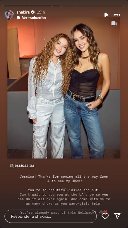 “¡Jessica! ¡Gracias por venir desde Los Ángeles a ver mi show! ¡Eres tan hermosa, por dentro y por fuera!”, escribió la colombiana. “¡Tengo muchas ganas de verte en el show de Los Ángeles para que puedas repetirlo! ¡Y acompáñame a todos los shows que quieras, un viaje de chicas! Ya eres parte de esta manada”, agregó.