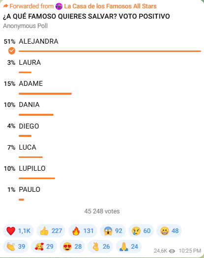 Según la encuesta de Universo Reality, Alejandra Tijerina es la favorita para continuar en el reality, con un 51% de apoyo del público. Le siguen: