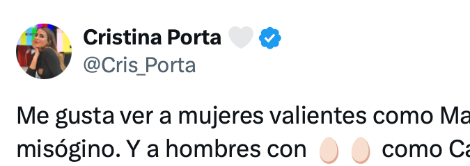 “Me gusta ver a mujeres valientes como Mane y Alejandra enfrentando al misógino. Y a hombres con 🥚🥚 como Caramelo, que lo encaran sin titubear. No puedes engañar a todos todo el tiempo“, expresó Cristina Porta.