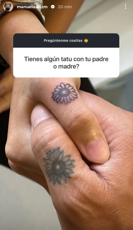 En lugar de responder con una explicación del tatuaje que comparten, Manuela decidió compartir una foto: se trata de una pequeña margarita que ambos tiene en el dedo pulgar de la mano.