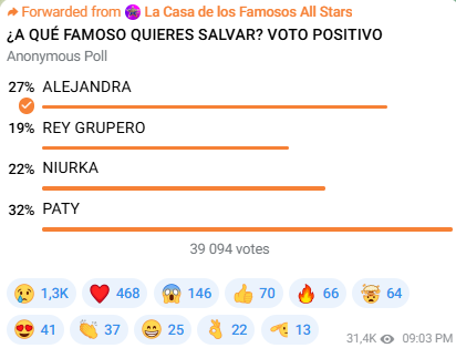 En el segundo lugar está Alejandra Tijerina con 27 % de los votos. En dicha encuesta han votado más de 39 mil personas y en el tercer puesto está Niurka Marcos con 22 % y en la última posición Rey Grupero.