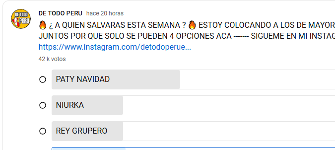 Por su parte, la consulta de ‘De Todo Perú’, también arroja resultados similares: Navidad está liderando las votaciones y después están Alejandra Tijerina, Rey Grupero y Niurka.