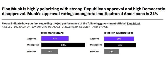 Talking just about Musk’s performance, 50% of the multicultural population disapprove of him, while 37% supports his work.