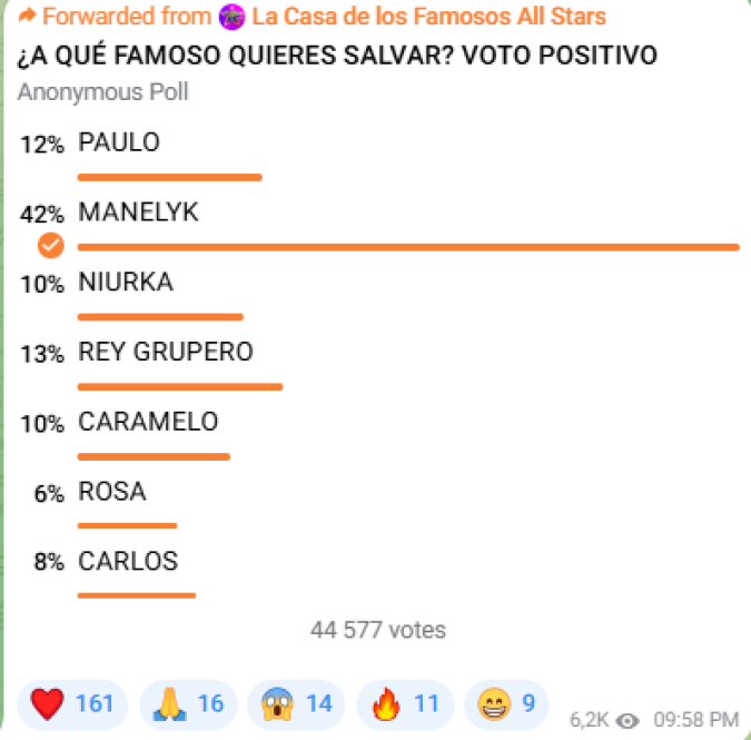 En el primer puesto de las votaciones, según Universo Reality, está Manelyk González, la estrella de reality show acumula 42 %. En el segundo puesto se encuentra Rey Grupero con 13 %.