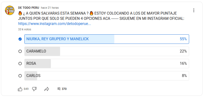 En este orden, los habitantes que están en peligro son Caramelo, Rosa y Carlos. La consulta de ‘De Todo Perú’ también lanza resultados similares.