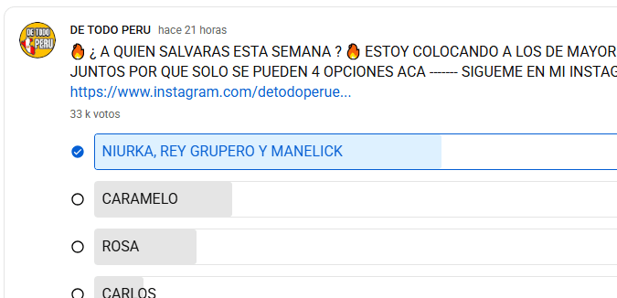 En este orden, los habitantes que están en peligro son Caramelo, Rosa y Carlos. La consulta de ‘De Todo Perú’ también lanza resultados similares.