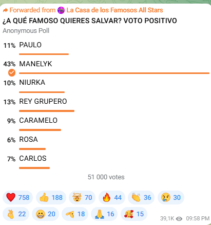 Como ocurrió la semana pasada, Manelyk González está liderando la tabla de votaciones. De acuerdo a Universo Reality, una cuenta dedicada al seguimiento del reality show, González tiene 43 % de aceptación.