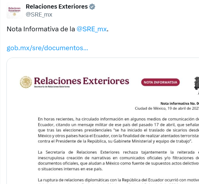 La Secretaría de Relaciones Exteriores de México calificó las versiones como “reiteradas e inescrupulosas narrativas” y negó categóricamente cualquier vínculo con actividades delictivas que afecten a Ecuador o su situación interna.