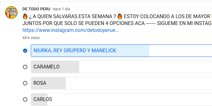 La primera encuesta consultada es la de ‘De Todo Perú’, una comunidad en YouTube que se encarga de monitorear el reality show, en dicha consulta el trío de Agua está en la primera posición.
