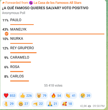 Mientras que Universo Reality, un grupo de Telegram que sigue de cerca la competencia, tiene resultados similares a ‘De Todo Perú’. En el primer lugar está Manelyk González con 43 % de los votos.