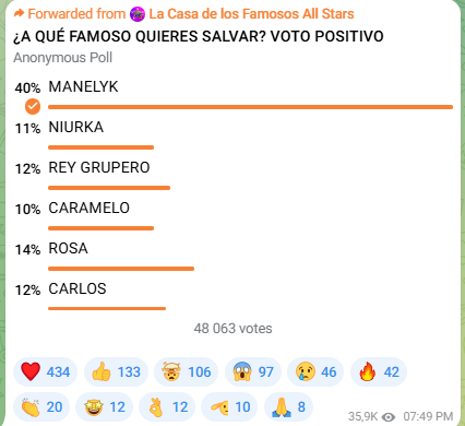 Manelyk González lidera con 40 % de los votos, en el segundo puesto se encuentra Rosa con 14 %, después le siguen Carlos y Rey Grupero. En las últimas dos posiciones están Niurka Marcos y Caramelo.