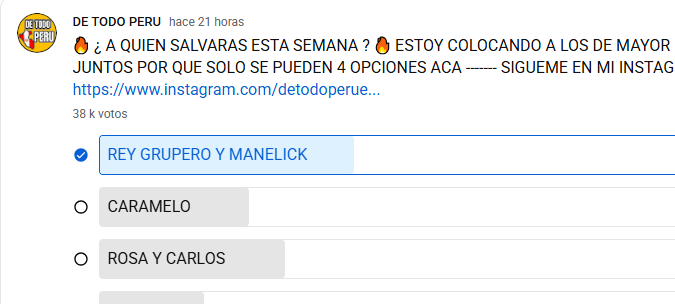 Por su parte, la encuesta de ‘De Todo Perú’, una cuenta de YouTube que se encarga de monitorear el reality show, tiene resultados similares.