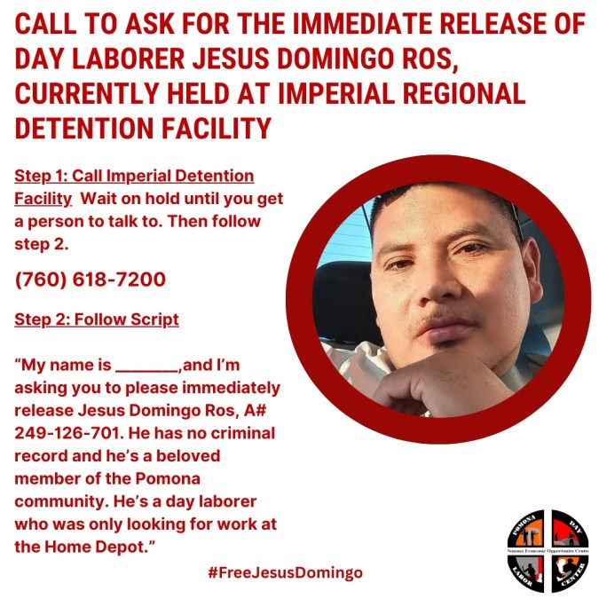 La comunidad lanzó una campaña de llamadas telefónicas para pedir al Centro de Detención Imperial  la liberación del guatemalteco Jesús Domingo Ros, llamando al 760-618-7200, y decir lo siguiente: “Mi nombre es… y estoy pidiendo por favor la liberación inmediata de Jesús Domingo Ross, #249-126-701. Él no tiene antecedentes criminales y es un miembro querido de la comunidad de Pomona. Es un jornalero que solo estaba buscando trabajo en el Home Depot”.