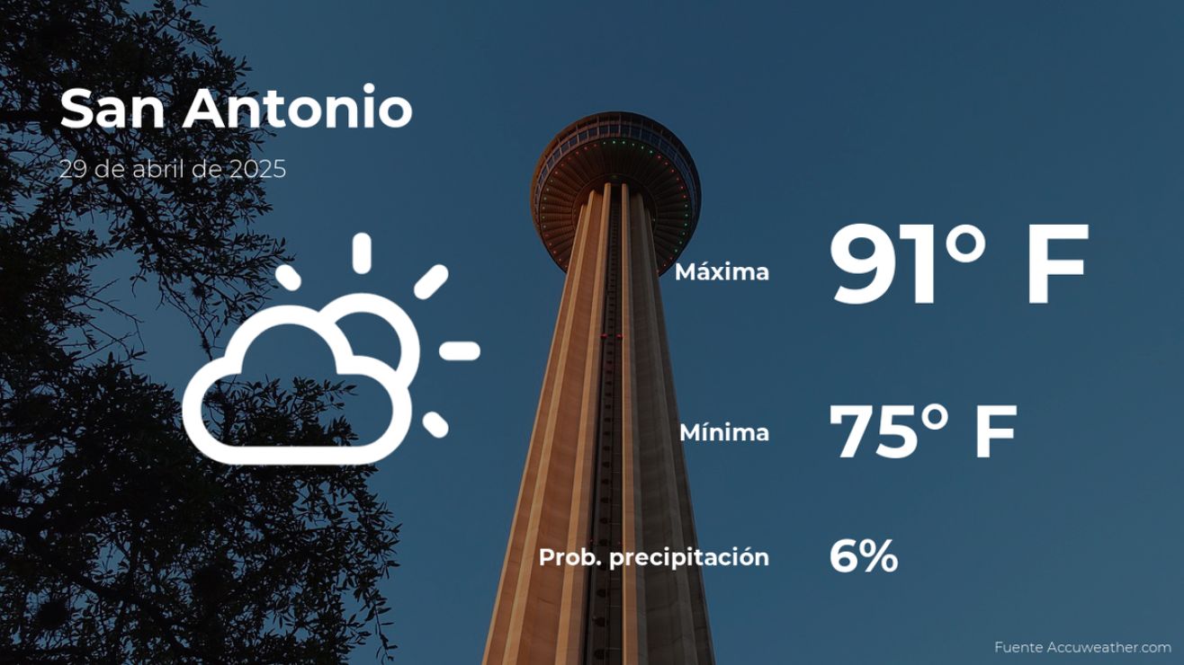 El pronóstico del tiempo en San Antonio, Texas, para mañana indica que se esperan cielos cubiertos con tormentas y lluvia. Las temperaturas tendrán una variación entre los 73 y los 88 grados Fahrenheit (23 y 31ºC).