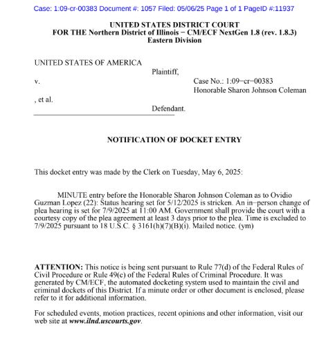 Como parte de un acuerdo con los fiscales, Ovidio Guzmán López, hijo de “El Chapo” Guzmán, tiene previsto declararse culpable ante la Corte del Distrito Norte de Illinois, Chicago, por lo que la audiencia programada para este 12 de mayo fue cancelada y en su lugar se realizará una “de cambio de declaración de culpabilidad” hasta el próximo 9 de julio.