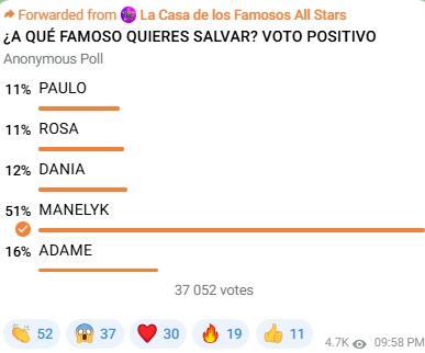 De acuerdo a la encuesta de Universo Reality, Manelyk González está en el primer lugar de las votaciones y acumula 51 %. En el segundo lugar está Alfredo Adame con 16 %, en el tercer puesto Dania Méndez con 13 % y en los últimos lugares están Rosa Caiafa y Paulo Quevedo.