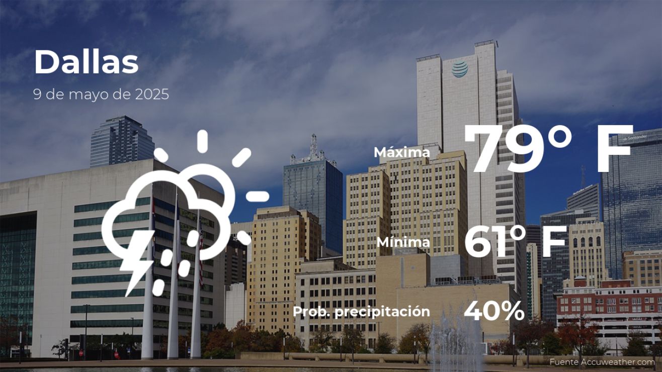 Este viernes 9 de mayo se espera que la temperatura en Dallas, Texas, suba hasta un máximo de 79 grados Fahrenheit (26ºC). La probabilidad de lluvia será del 40% y se prevén más nubes que claros. Por otro lado, se estiman ráfagas de viento de hasta 10.56 millas por hora.