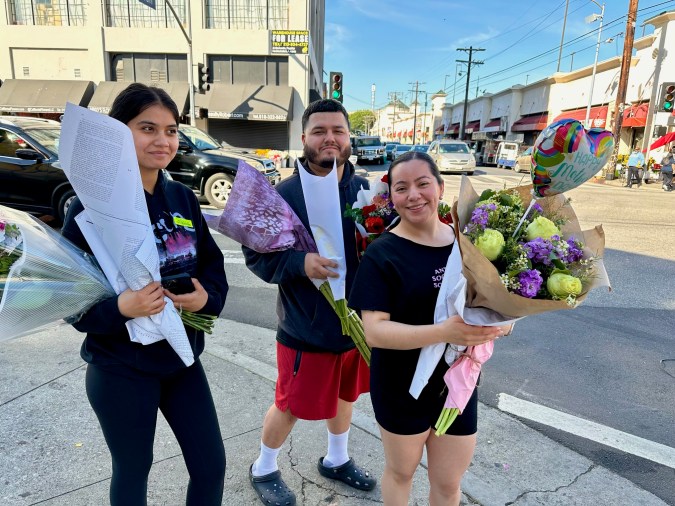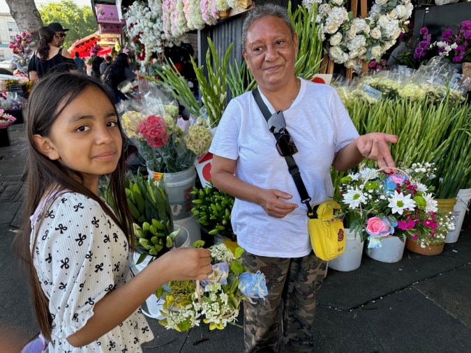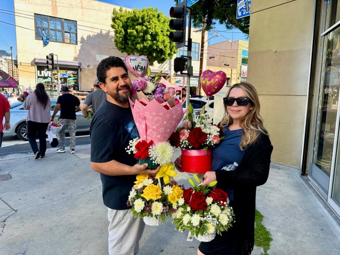 Lorena y Jaime López manejaron desde su casa en Lynwood, en el sur del condado de Los Ángeles hasta el centro de la ciudad para adquirir las flores para las mamás de su familia.