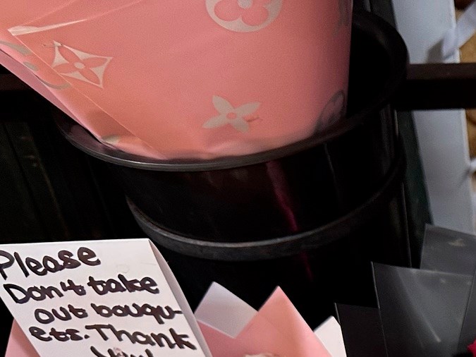“Se nos fueron $250 dólares. Y sí están un poquito más baratas aquí las flores que en otros lugares. Valió la pena, y aquí vamos sudando la gota gorda”, dice mientras ella y su esposo hacen malabares para sostener los varios ramos de flores.