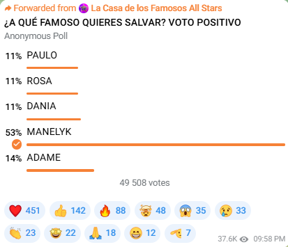 Manelyk González está liderando las encuestas independientes. En Universo Reality, González acumula 53 % de apoyo de los fans y el siguiente es Alfredo Adame con 14 %.