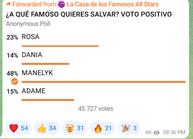 Manelyk está en el primer lugar de las votaciones con 48 % de los votos, en el segundo puesto se encuentra Rosa Caiafa con 23 %, en el tercer puesto Alfredo Adame y con 14 % Dania Méndez.