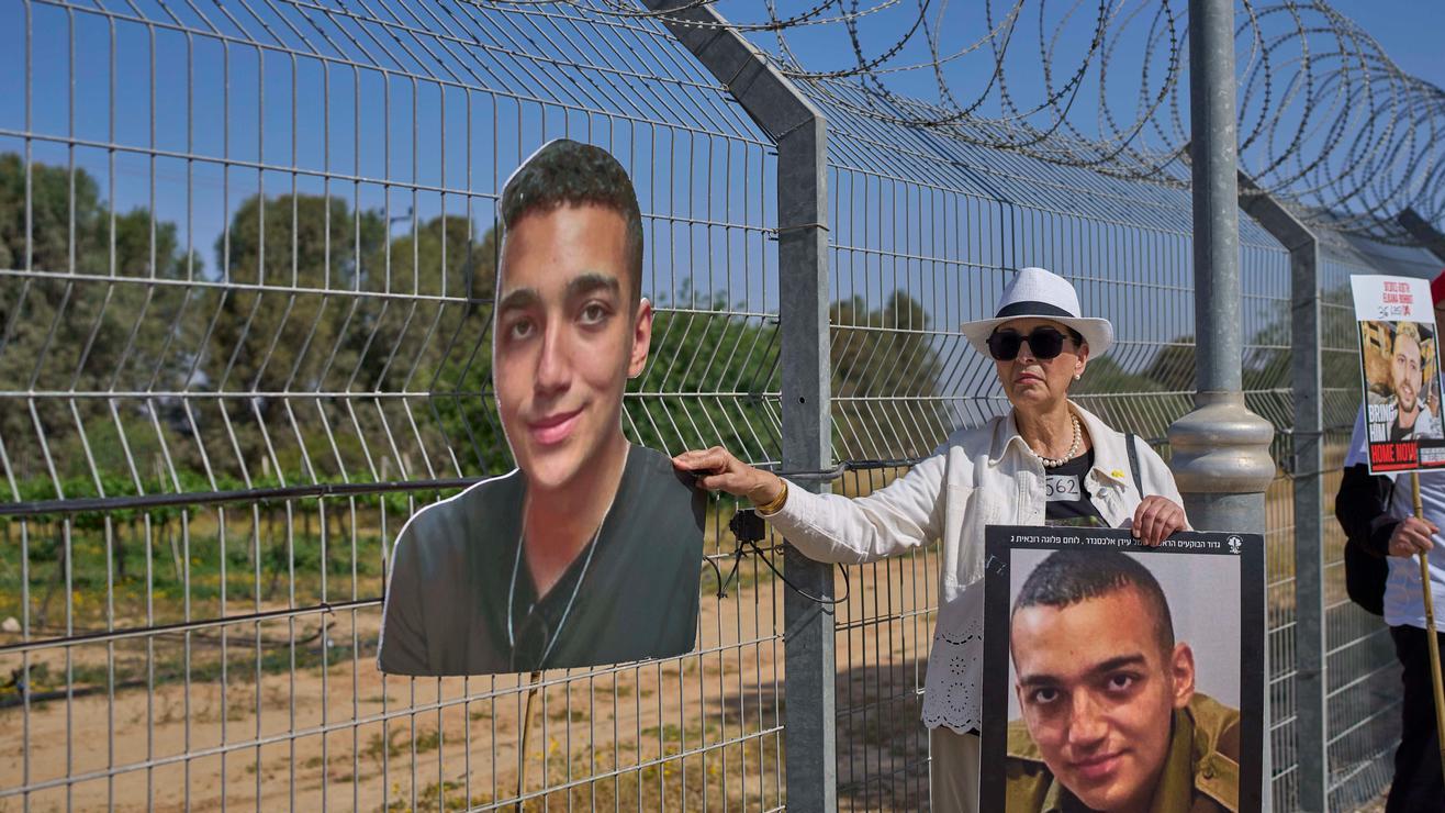 La abuela de Edan Alexander sostiene fotografías de su nieto en una protesta en la frontera con la Franja de Gaza, en el kibutz Nir Oz, sur de Israel (20.04.2025) Crédito: Deutsche Welle